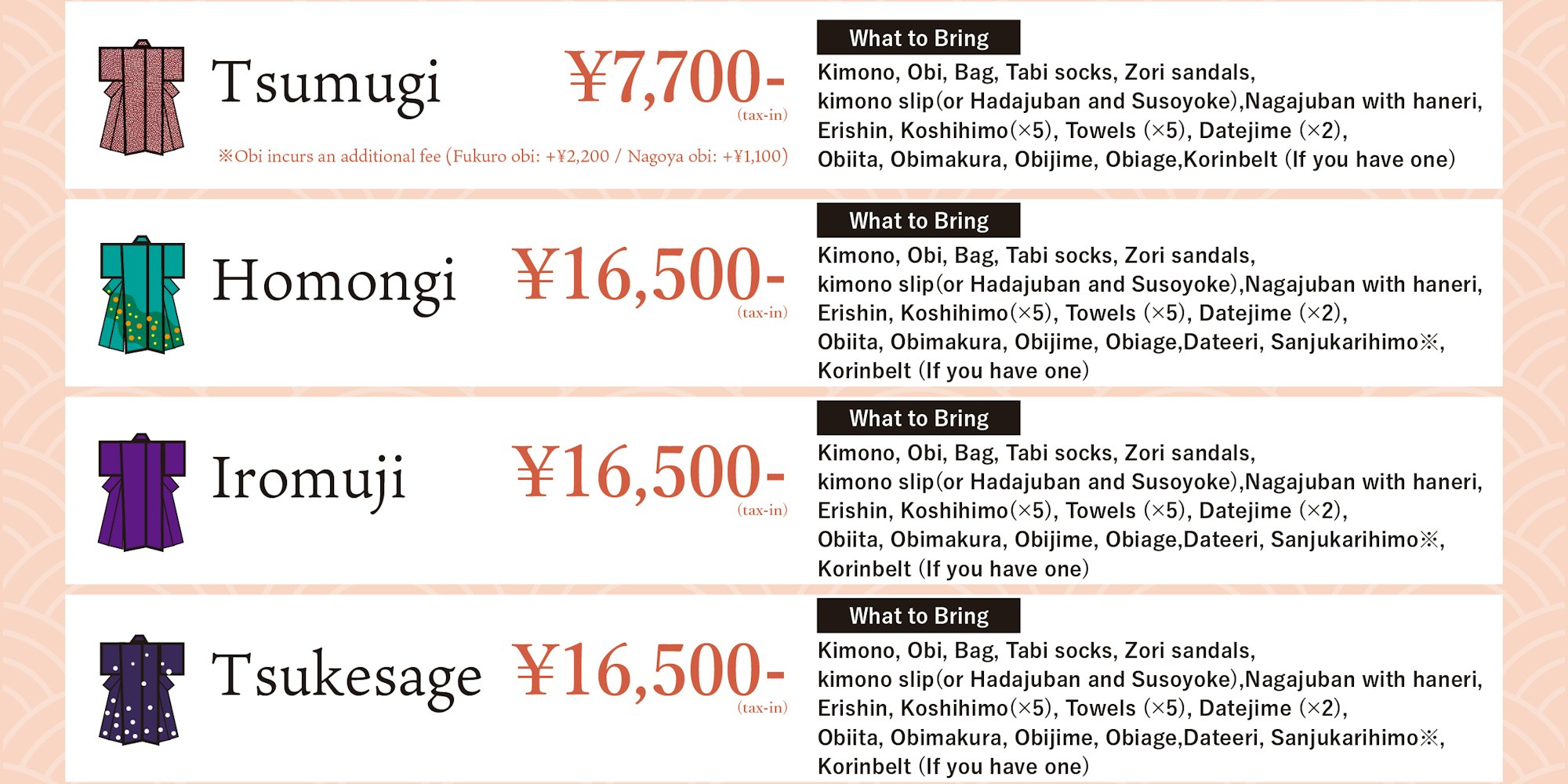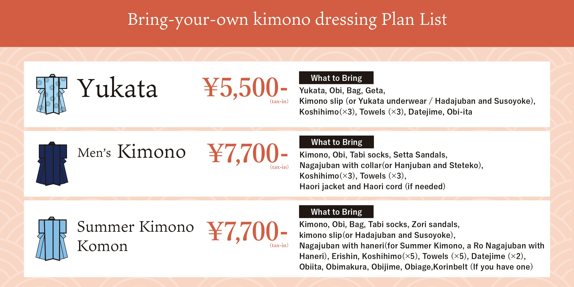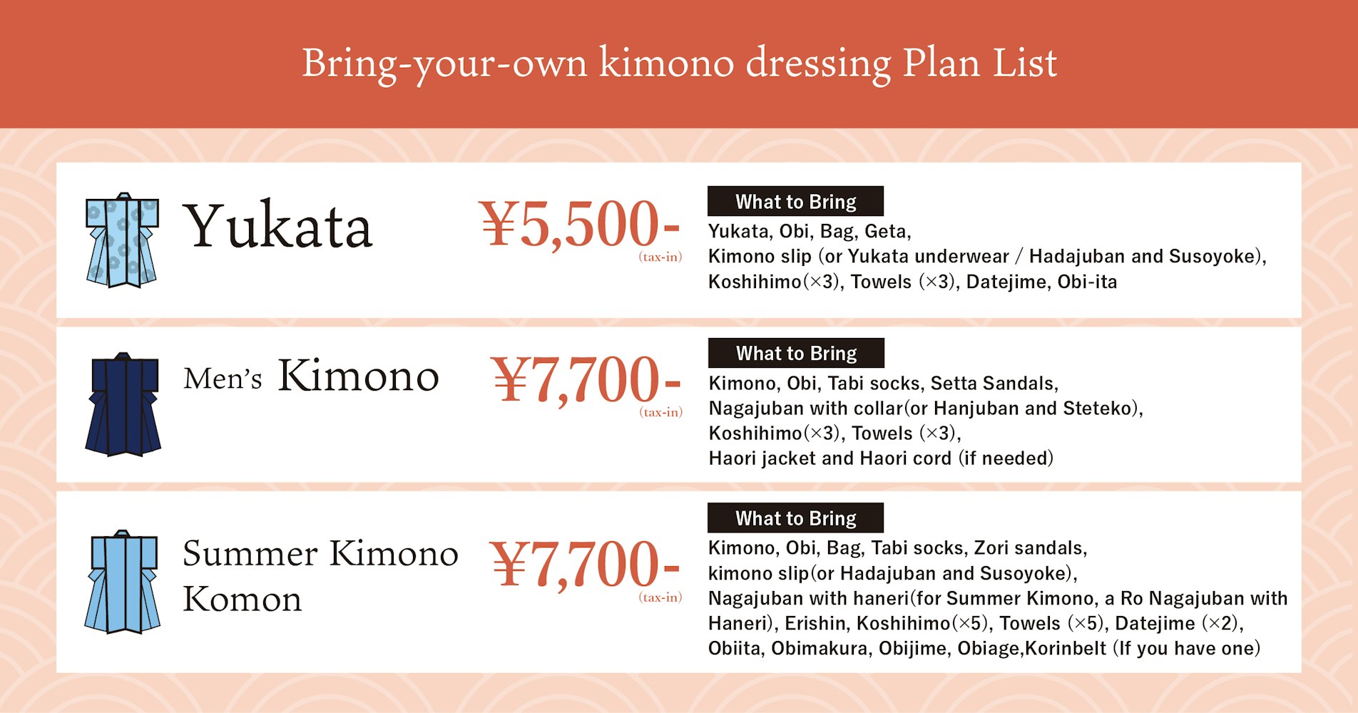 Bring-Your-Own Kimono Dressing Price List