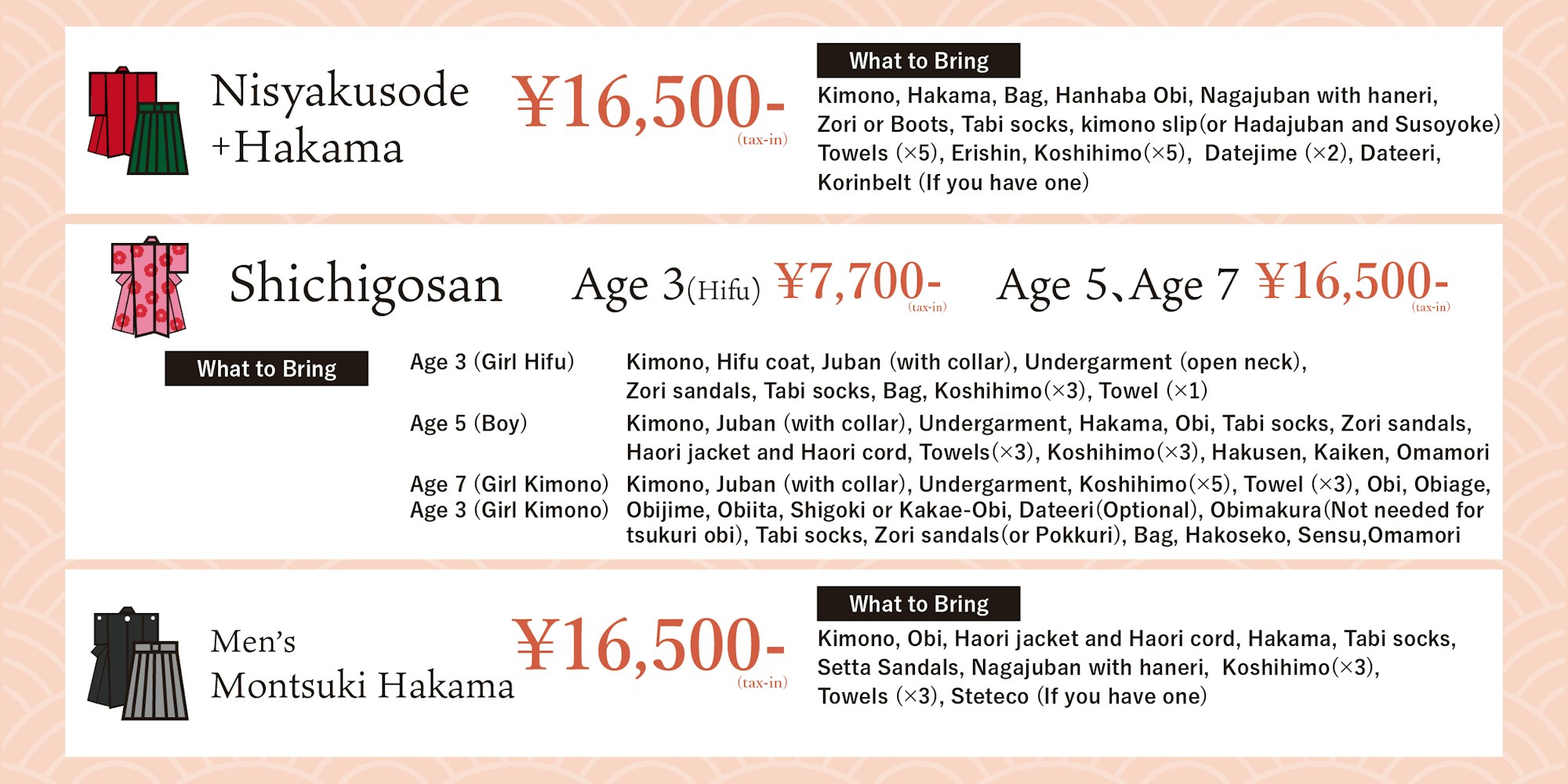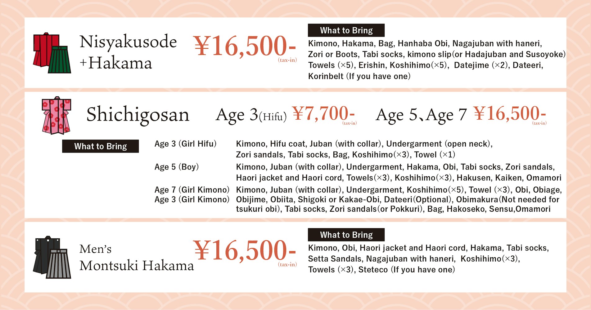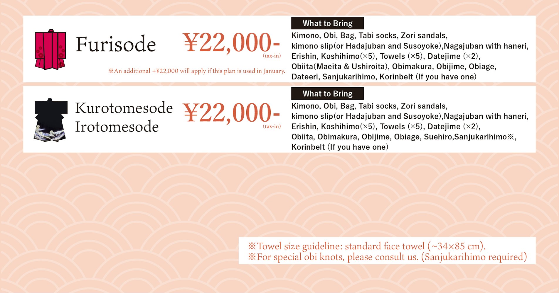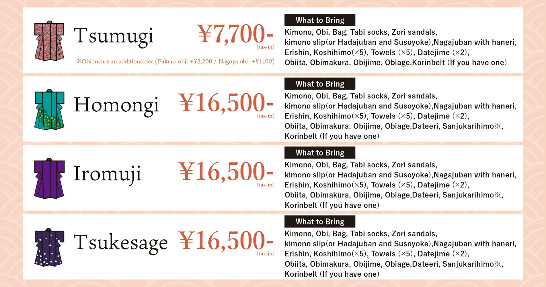 Bring-Your-Own Kimono Dressing Price List