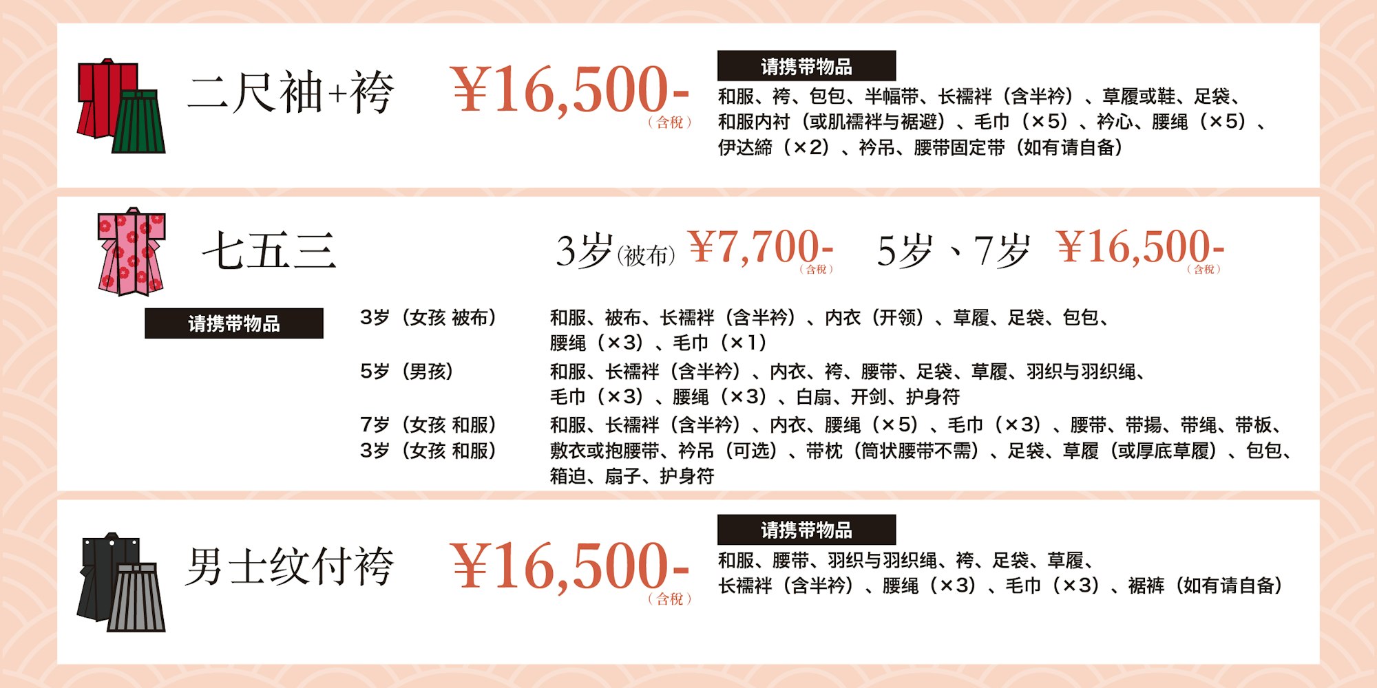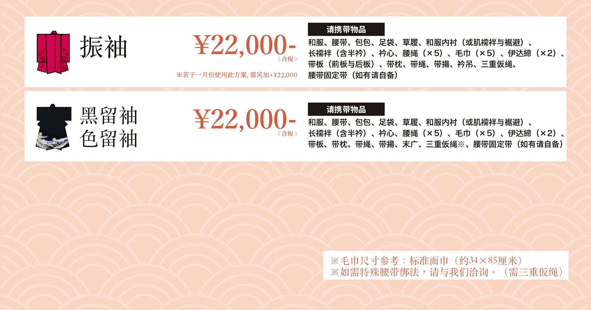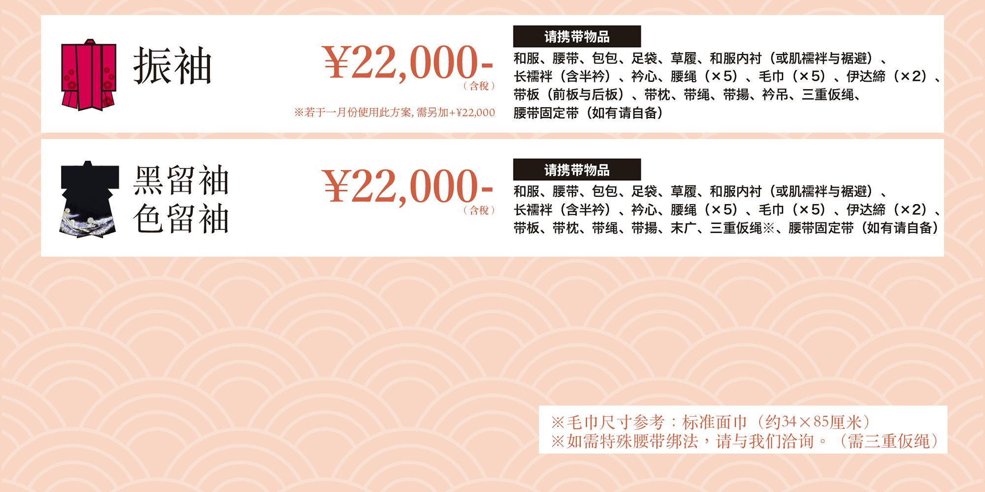 请在穿戴和服日期前5至3天内将物品带到店里,或通过邮寄方式寄送。