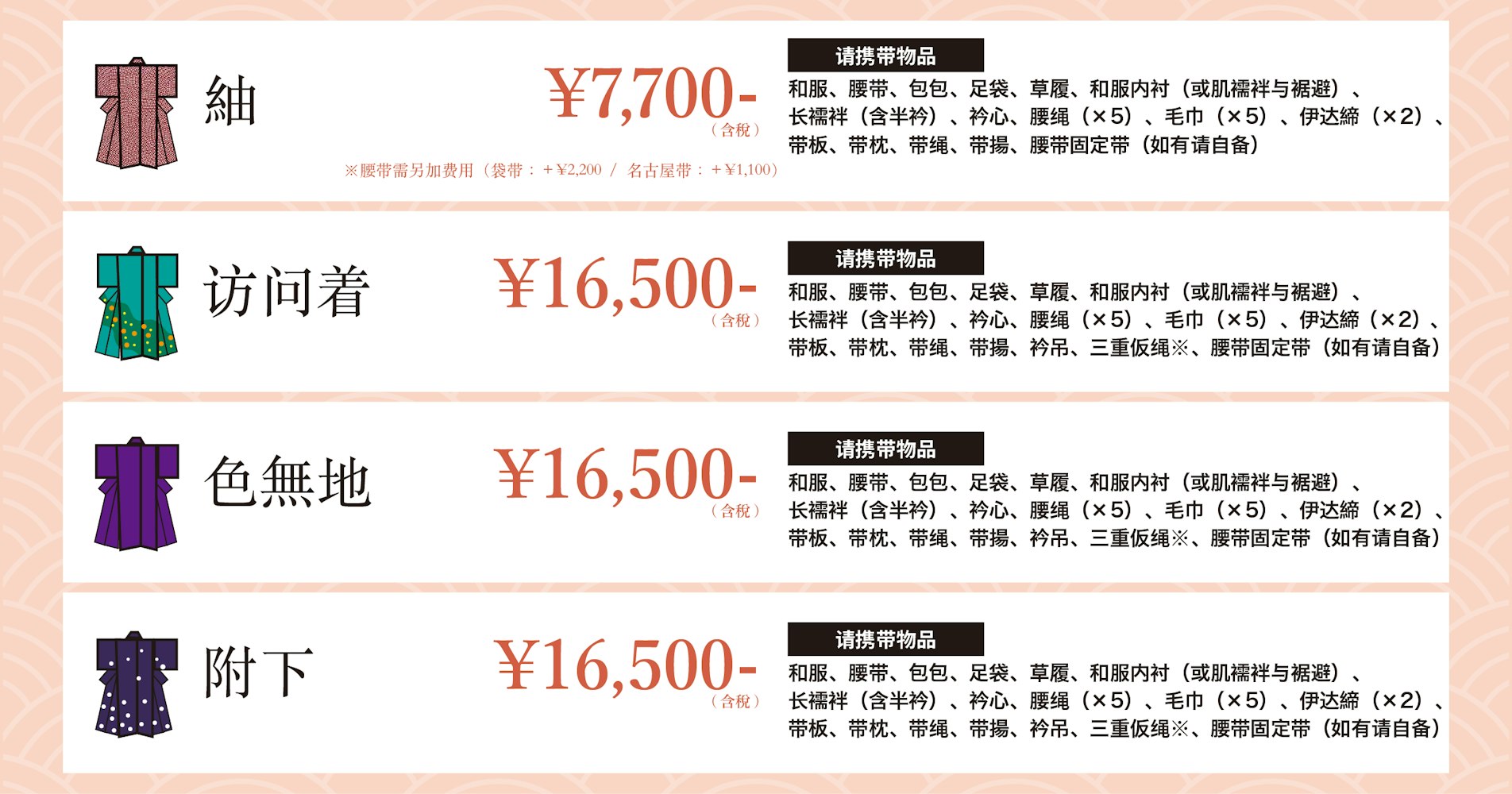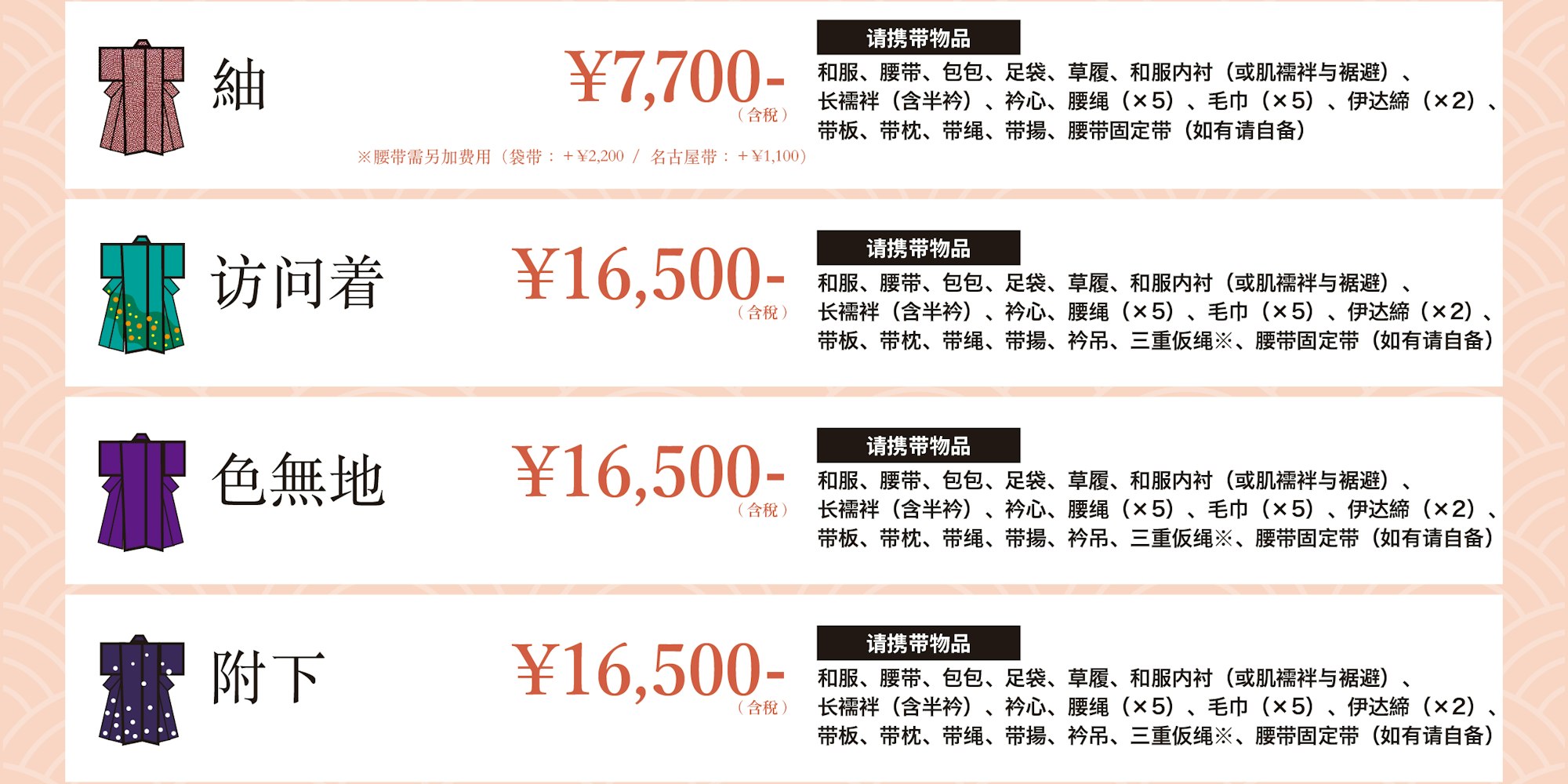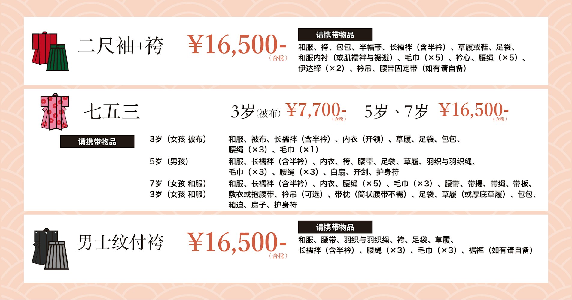 请在穿戴和服日期前5至3天内将物品带到店里,或通过邮寄方式寄送。