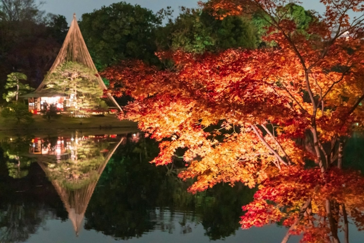 Rikugien’s autumn illumination showcases colorful maples and ginkgo under night lights. Stroll around the pond, tea houses, and stone bridges to enjoy the garden’s unique design. wargo Ginza offers a next-day return option (+1,100 yen), ideal for enjoying the evening illumination in kimono.