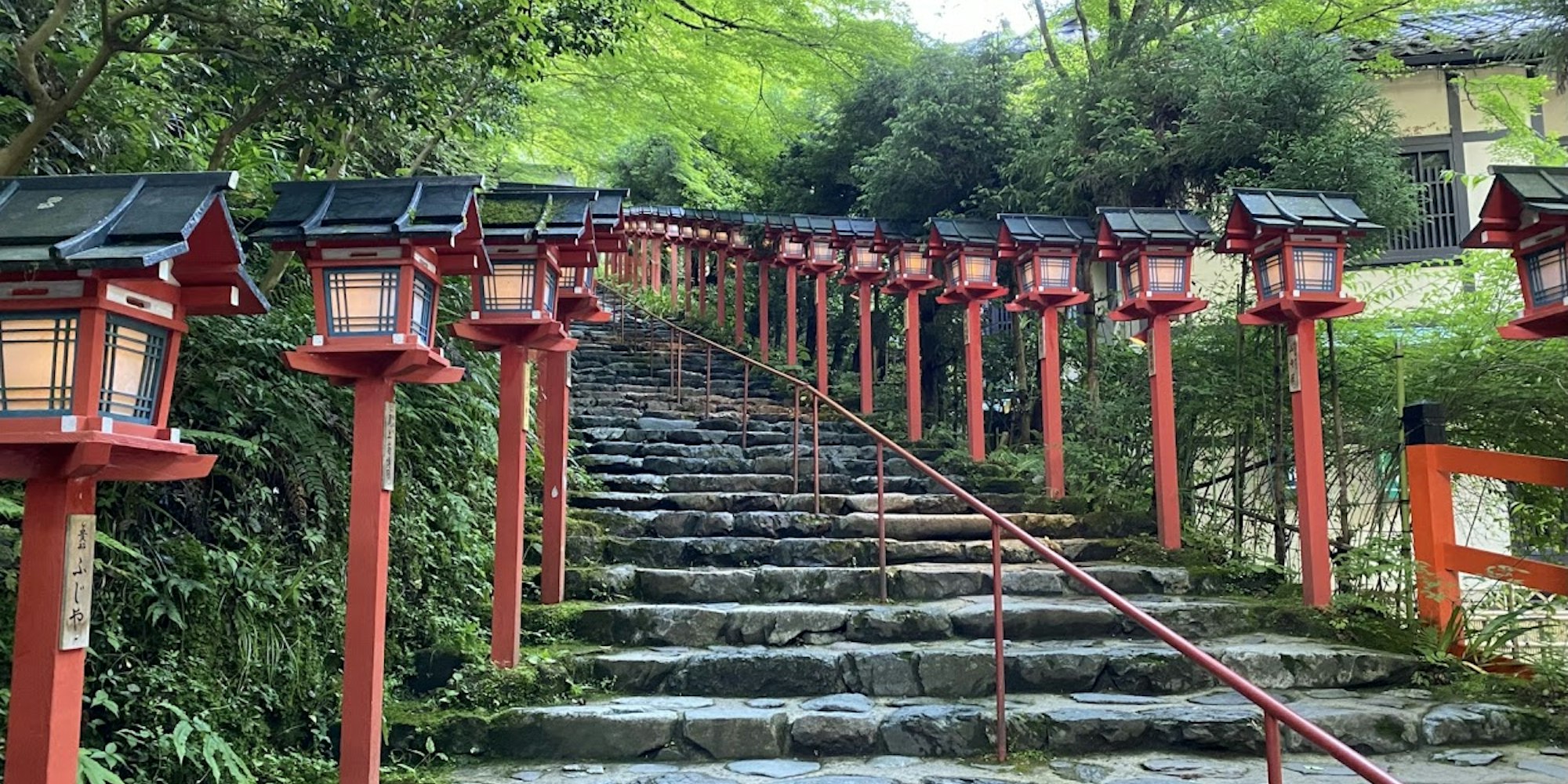 The lantern-lined path and surrounding trees, known for their autumn colors, are beautiful in May when new green leaves envelop the shrine. Kifune Shrine, standing protected by thick foliage that almost darkens the area, has a mystical atmosphere that makes you feel the breath of life itself.