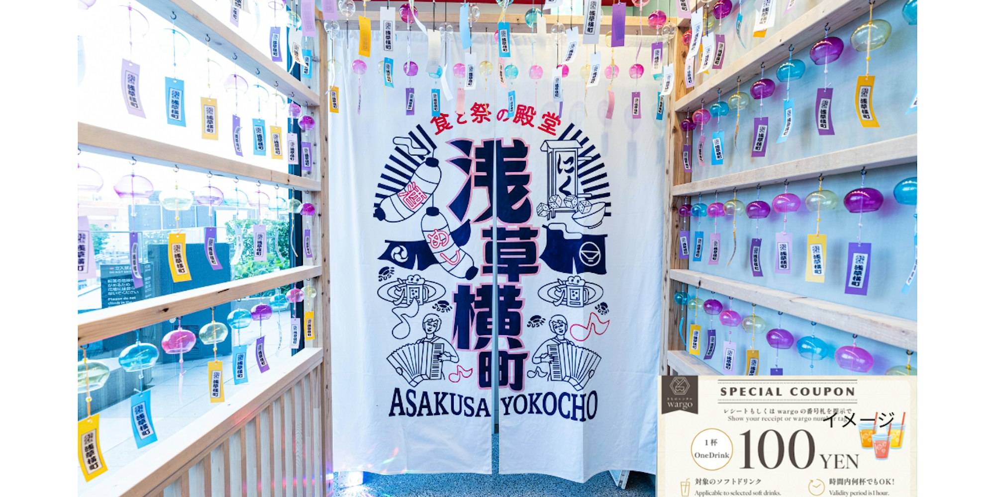 きものレンタル wargo浅草店で着物レンタルをしていただいたお客様を対象に、浅草横町で利用できる1ドリンク100円チケットをプレゼント。お連れ様を持っている際やご返却時などに同フロアの飲食店でドリンク休憩をお楽しみください。
